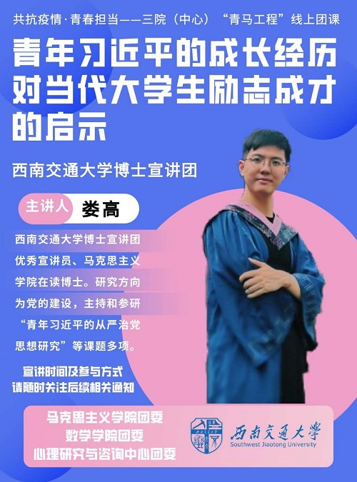 为进一步提高大学生骨干、团干部、青年知识分子等青年群体的思想政治素质、政策理论水平、创新能力、实践能力和组织协调能力,使其进一步坚定跟党走中国特色社会主义道路的信念,成长为中国特色社会主义事业的合格建设者和可靠接班人。马克思主义学院团委、数学学院团委、吃瓜黑料 团委定于2020年4月23日举办“青年习近平的成长经历对当代大学生励志成才的启示”专题讲座。现将有关事宜通知如下: