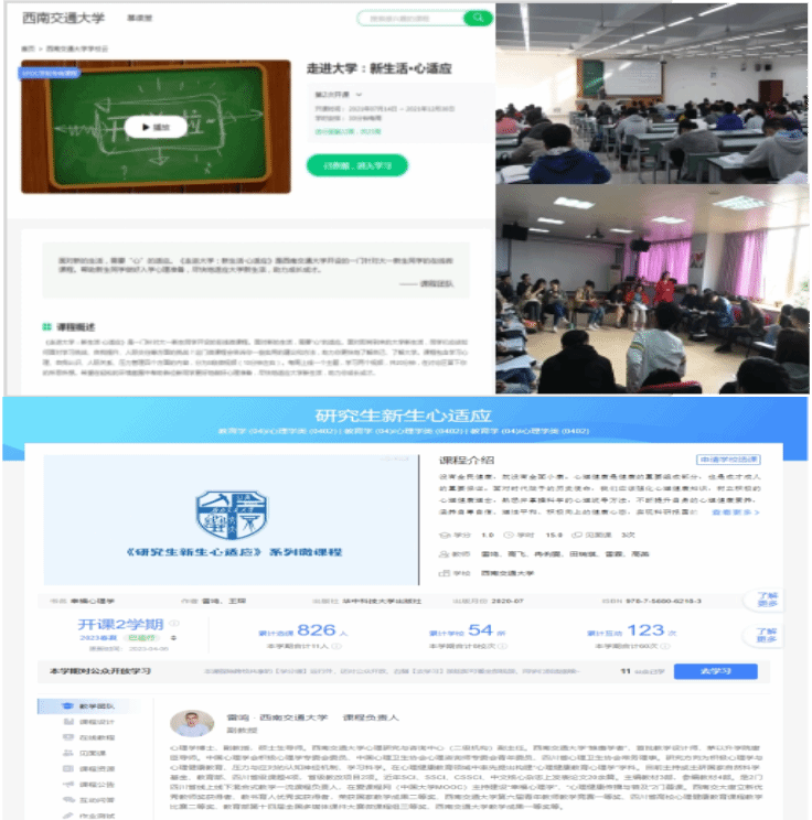 为本科新生开放“走进大学:新生活·心适应”在线微课程,促进中学-大学衔接;为研究生新生开设“研究生新生心适应”系列微课,促进研究生心理疏导与自我促健;为本研毕业生开展心理助航行动,促进学生从大学到社会的过渡。