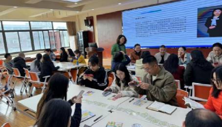 讲座进入第一阶段,叶教授以一个案例引入了如何利用OH牌进行自我探索。在场师生自行分成四组,轮流使用不利手洗OH牌并从中选取代表“他人眼中的自己”、“自己眼中的自己”的卡牌,随后小组成员之间分享卡牌带给自己的感受。叶教授强调,分享过程中要做到不评判、不打断、不催促他人发言。所有人都沉浸其中,现场氛围热烈。