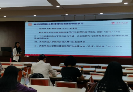 教师师德失范行为处理办法》中的重要内容。她强调,中心全体教师要加强思想政治和师德师风的学习,规范职业行为,明确师德底线,时刻自重、自省、自警、自律,把教书育人和加强自我修养紧密结合起来,自觉做到以德立身、以德立学、以德施教、以德育德,努力争做“四有”好教师。