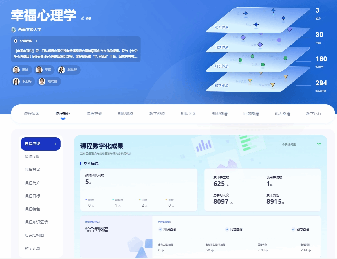 为推进心理健康通识课程数字化建设与创新,深化国家级一流课程的教学改革,促进AI技术与教育教学深度融合,打造新形态教学模式,推动心理健康通识课程高质量发展,国家级一流课程教学团队经过不懈努力,在教务处和智慧树网等部门的大力支持下,建成课程知识图谱。《幸福心理学》课程知识图谱已在2023年下半年已成功在智慧树网上线,并在本学期全面应用,取得了初步成效。
