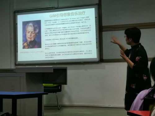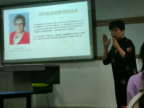 首先,从一个观声音的小活动开始。魏艳老师说:音乐无处不在,所以我们先从听声音开始。她让大家闭上眼睛,静静地聆听周围的声音,用心体会这些声音给我们带来的感受,并说出自己最喜欢的声音是什么。接着魏老师介绍了两种音乐疗法:GIM引导想象音乐治疗,MIR音乐想象放松技术。