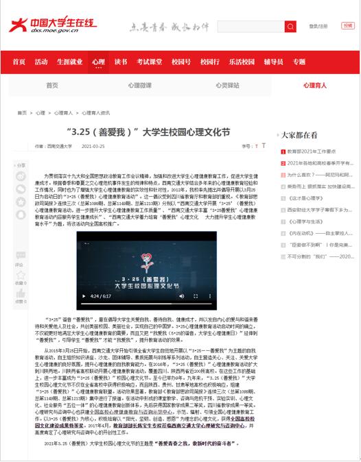 编辑的“3•25(善爱我)大学生校园心理文化节”微视频《善爱青春之我,做新时代的奋斗者》。这也是教育部中国大学生在线网站、在线官微连续三年报道3·25(善爱我)大学生校园心理文化节。新浪网等主流媒体也进行了转发。