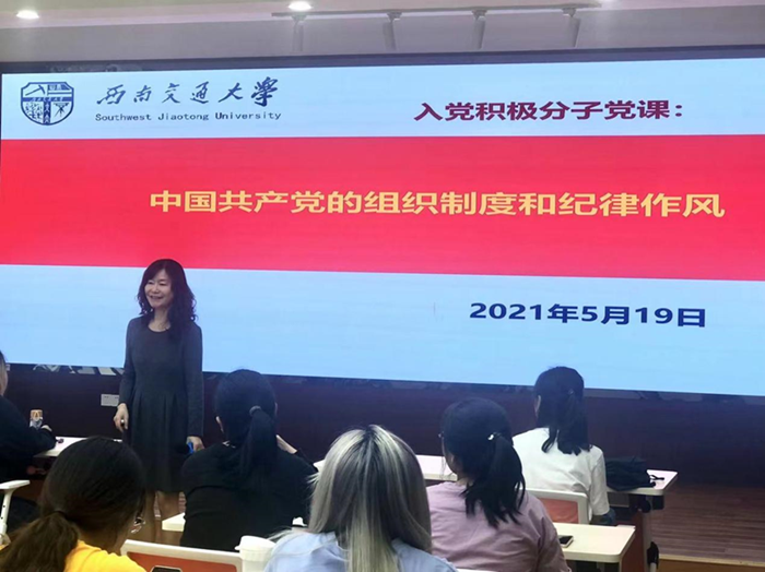 2021年5月19日18:30,陈华主任为积极分子主讲了题为《中国共产党的组织制度和纪律作风》的专题党课。她指出,民主集中制是民主基础上的集中和集中指导下的民主相统一,党在组织和领导工作中既要充分发扬民主,也要善于集中,把二者紧密结合。接下来陈主任对党的纪律和“三大优良作风”进行了讲解。她指出,党的纪律是按照党的纲领和民主集中制原则,根据革命和建设实践的需要而提出的,无论是积极分子还是党员同志,都要把纪律挺在前面,保持敬畏之心,规矩做人、踏实做事。最后,陈主任结合正反两方面的案例向积极分子讲解了党“理论联系实际、密切联系群众及批评与自我批评”的三大优良作风。