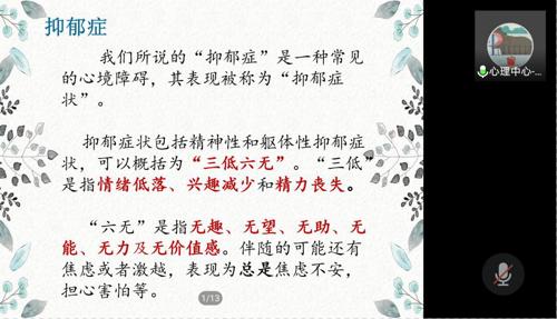 接着,朋辈导师张书宇对一些常见心理障碍症状以及如何识别,面对不同程度心理问题时如何应对等内容进行了详细的讲述。心理障碍是指一个人由于种种原因而导致的各种异常的心理过程、人格特征和行为方式,对本人和社会带来的不适应。关于抑郁症,张书宇提到了“三低六无”以及与抑郁情绪的区分。在讲到焦虑时,他尤其强调在目前大学生群体中存在的社交焦虑、学业焦虑、就业焦虑等,并针对这些普遍存在的焦虑给予了一些可采取的应对方式建议。除此之外,讲座中还列举了精神分裂症、进食障碍、强迫症、疑病症的表现症状。每一个心理问题都有相应的例子和提问,以求让在场的心理观察员更加清晰明了理解相关内容。讲座最后,朋辈导师张书宇希望在场的心理观察员能助人自助,充分发挥自身作用。