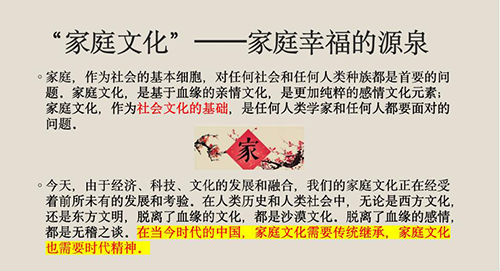 唐静老师从五个方面来讲解家庭文化建设。第一是家庭文化建设的时代意义;第二是家庭文化的内涵;第三是中国家庭文化的特征;第四是中国家庭教育文化;第五是家庭文化的构建。