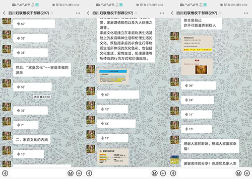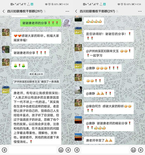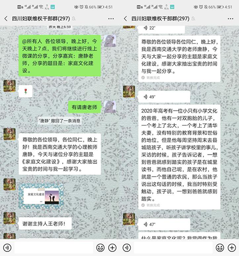 与成都太阳花社会工作服务中心承办的婚姻家庭辅导项目线上微课在省妇联维权干部群中展开。此次微课的主题是“家庭文化建设”,主讲老师为科普基地的唐静老师。