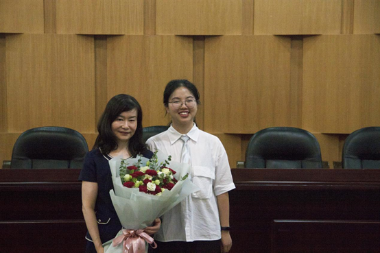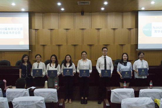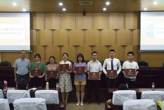 接下来,陈华主任和雷鸣副主任分别为2020届本科毕业生和硕士研究生毕业生颁发毕业证书并与合影留念。同时,学生代表何亚男同学向陈华老师献上鲜花,感谢母校、中心和老师们的谆谆教诲和辛勤培养。