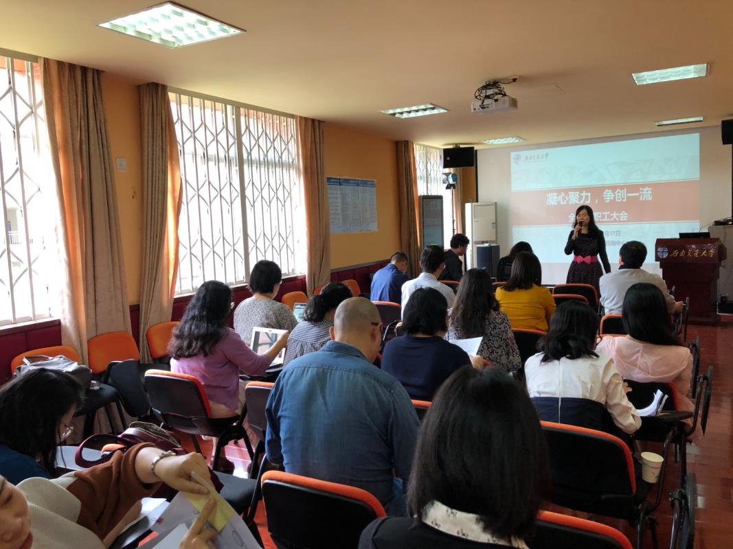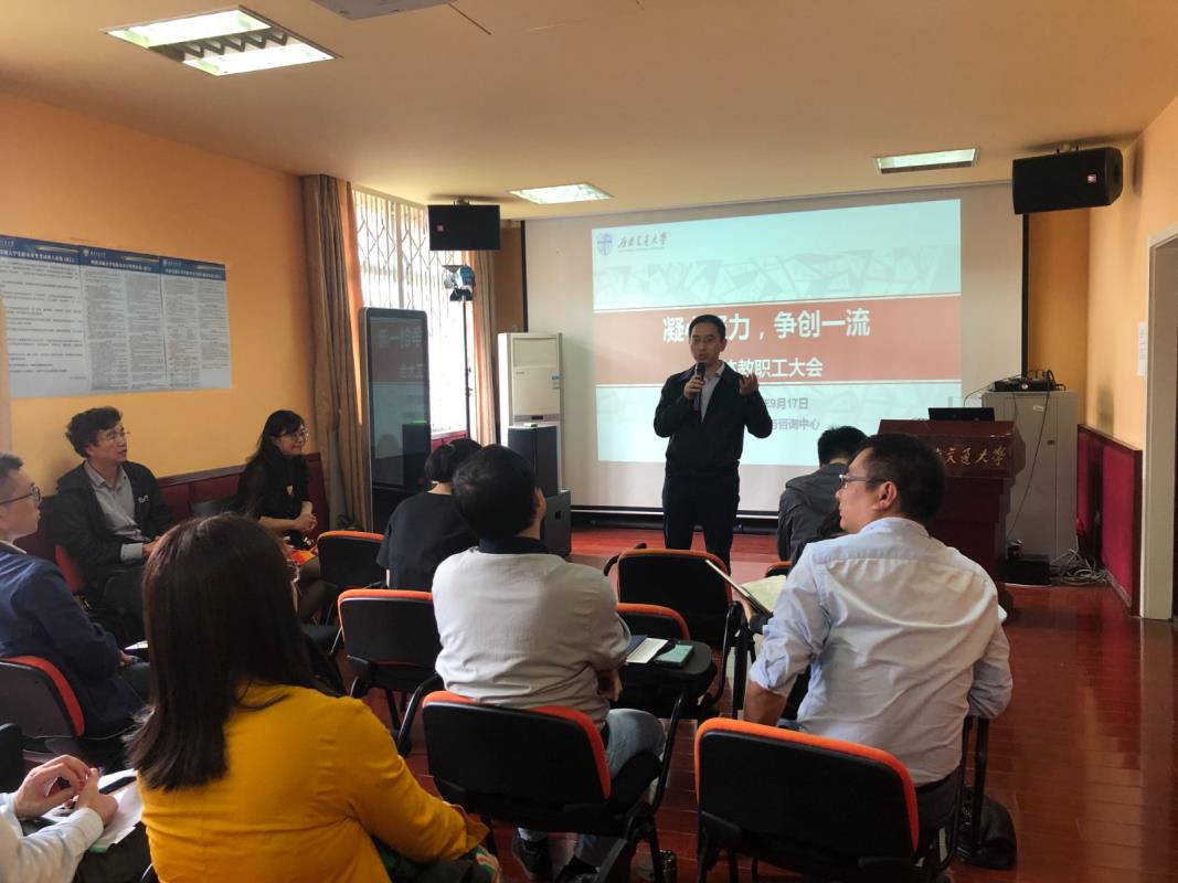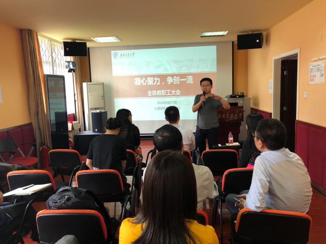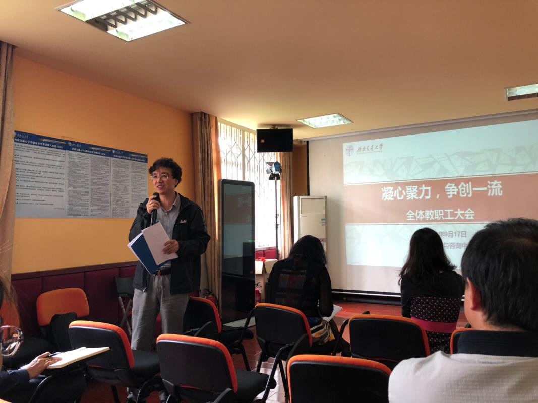 2020-2021学年第一次全体教职工大会在犀浦校区5322召开,全体教职工参会。会议由陈华主任主持,诚邀教务处副处长康锐、教务处质量评估办公室主任冷伟来中心交流工作。