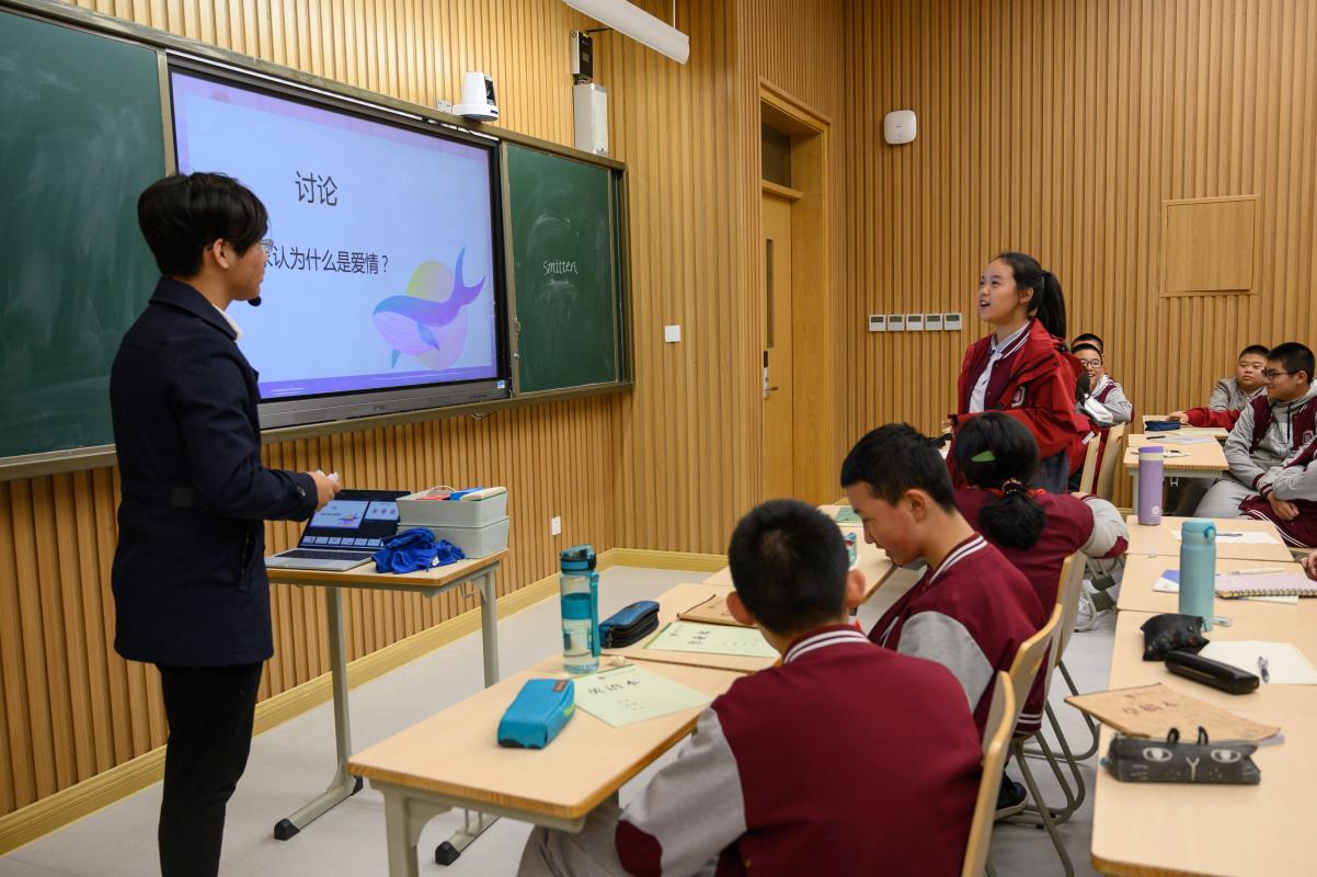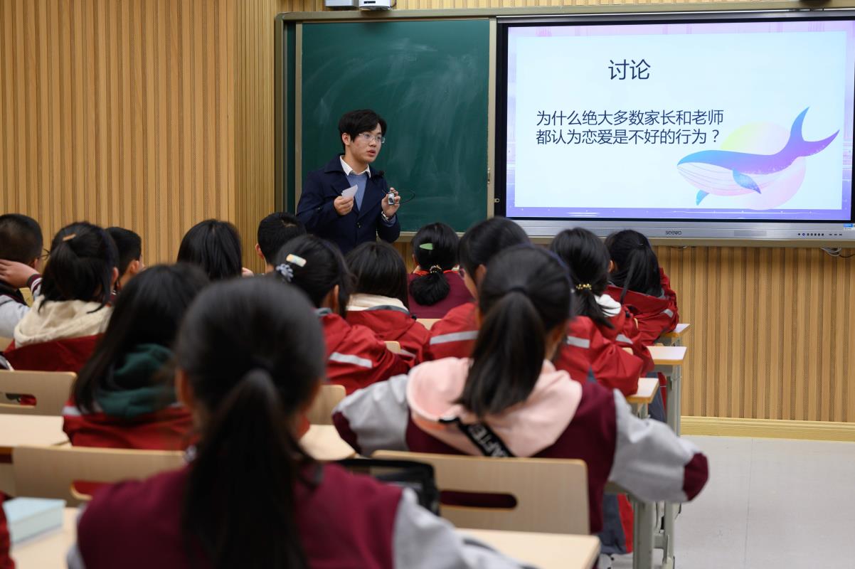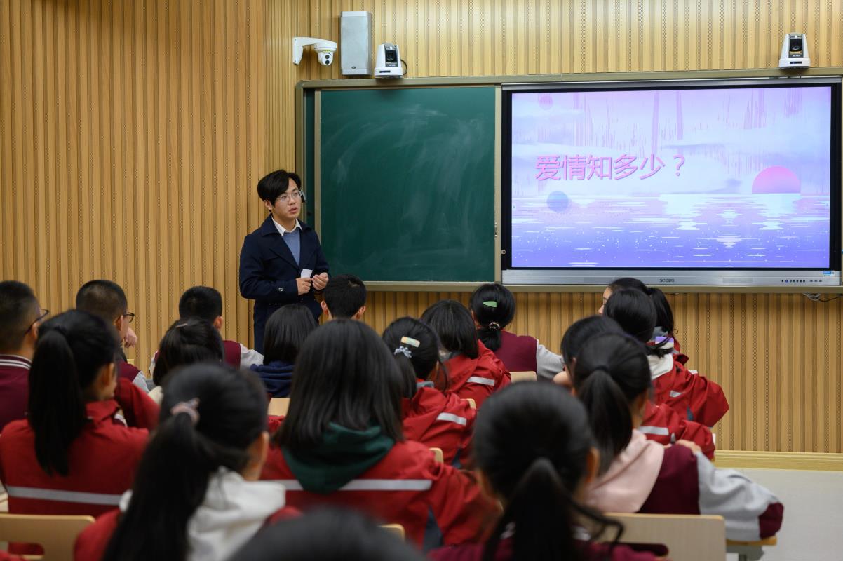 学生齐子行等人在领队老师唐静的指导下来到了金苹果锦城第一中学,进行了一场时长四十分钟的爱情主题教育活动,旨在引导初中生正确看待萌发的感情,树立科学的爱情观。