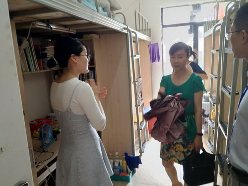副主任陈华老师以及副书记兼学工组组长柯小君老师去到我们本研新生宿舍去看望我们2018级本研新生。老师们亲切地与同学们谈论着初到学校的感受,关心着新生们的学习和生活上的状况。同时,也为新生们检查寝室状况。对于宿舍内设施有问题的宿舍,柯小君老师也为其打电话报修。