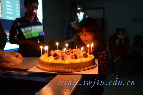 就在大家都以为晚会到此结束的时候,令人难忘的一幕出现了:会长上台以“抽奖”的形式请上了一位女同学并蒙上了她的眼睛,紧接着,一个点着蜡烛的生日蛋糕被送进了会场——原来今天是这位女同学的生日。全场同学为她齐唱生日歌并送上祝福,由于光线太暗,不能肯定这位同学是否流泪,但是可以肯定的是,这个生日将使她毕生难忘。这是我们心理学会人用“心”做出的生日蛋糕,生日歌响起的那一刻,也是我们心理学会人用“心”送上的祝福,相信在场的每一位同学都将永远铭记这一刻。