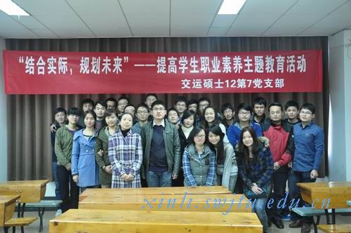 11月8日下午2点,“结合实际,规划未来”——提高学生职业素养主题教育活动在九里校区逸夫馆4304B准时开始。此次主题教育活动是交运2012级硕士第7党支部针对本专业研究生就业形势,旨在帮助更多的同学认清社会的需求,制定职业生涯规划,不断提高自身的能力,为就业做好准备而组织开展的。