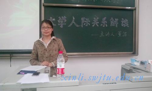 当今社会没有人不承认人际关系很重要,但也没人否认人际关系很复杂。有人说,做人难,做好人更难,更有人将其形容为难于上青天,尤其是在以独生子女为代表性的“90后”一代大学生,人际关系由于以个人为中心更是蒙上了一层复杂的氛围。董洁老师希望“大学生人际关系”讲座能对同学们产生一定的影响,让他们更深入的了解人际关系,更好的处理人际问题,结交更多的朋友,拥有更快乐的大学生活。