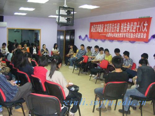 毕业生党员专项分享座谈会在5229教室举行,旨在加强各年级的经验交流,促进学生党员与预备党员、入党积极分子的全面发展,加强支部建设,创先争优迎接“十八大”的到来。