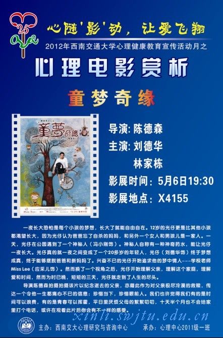 主办、2011级心理一班承办的“呵护心灵,结伴青春”525系列活动之“心随影动,让爱飞翔”心理电影赏析活动在X4155顺利开始。