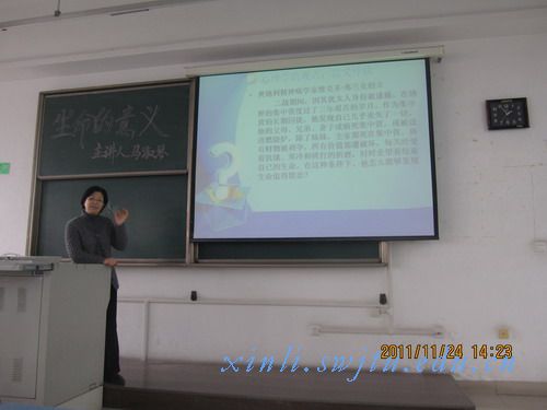 讲座开始,马老师先让同学们玩了一个小游戏。在一些无规律的数字中数有多少个“1”。但最后她却问有多少个“5”。面对完全没有预料到的问题,同学们显得一片茫然。她解释道:每个人看问题的角度都是不同的,对于生命的意义无非就是积极与消极,关键是我们怎么看待这个问题。随后她引用奥地利精神病学家维克多·弗兰克的例子:二战期间,他全家都被关进纳粹集中营,期间饱受折磨,但他还是存活了下来,不仅他的一些基本思想得到了深刻的检验,并且真实的感触让他感受到了生命意义的强大。我们获得生命的意义有3种途径:创造与实现,经验与体验,挫折与受难。人生的意义是创造出来的。人不仅是为自己而活,也是对他人或某些东西负责。由他创立的意义治疗,是指协助患者从生活中领悟自己生命的意义,借以改变其人生观,进而面对现实,积极乐观地活下去。