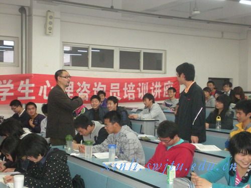 讲座开始之前本站记者特别采访了本次讲座的承办单位-----大学生心理学会会长杨烨。他介绍,根据前几场的讲座情况,这场讲座的听众估计也会在150人左右,这些听众有的是心学内部人员,更多的还是心学外部的广大心理爱好者。此时,蒋老师也提前到场了,本站记者也有幸采访了他。当被问及本次讲座的意义时,蒋老师简要通俗地答道:“既然大学生都憧憬爱情,也适合恋爱,我们作为心理学老师就有责任给予一定的指导”。