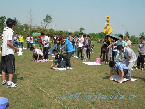 首先进行的比赛是飞毯抢水。这项比赛主要考验团队之间的合作能力。要求两个人同时在飞毯上,用水杯向放在终点的水盆里倒水。每组队伍在其引导员的指导下,按照游戏规则,在飞毯上“快步”行走。每个队伍有着自己的节奏,行走进度也大不相同。有的队伍在移动的过程中,由于拿水杯的同学跳的节奏快于拖飞毯的同学,以至于两个人撞在一起,水杯里的水全撒出来了,只能回去再端水了。有的队伍由于拖飞毯的同学没有把握好尺度,导致拿水杯的同学在跳跃后落在了飞毯外,按照游戏规则,他们也要回到起点,重新开始。比赛进行得相当激烈,选手们聚精会神,拉拉队加油鼓劲。很快第一轮比赛结束,取水最多的在这一轮得分最高。