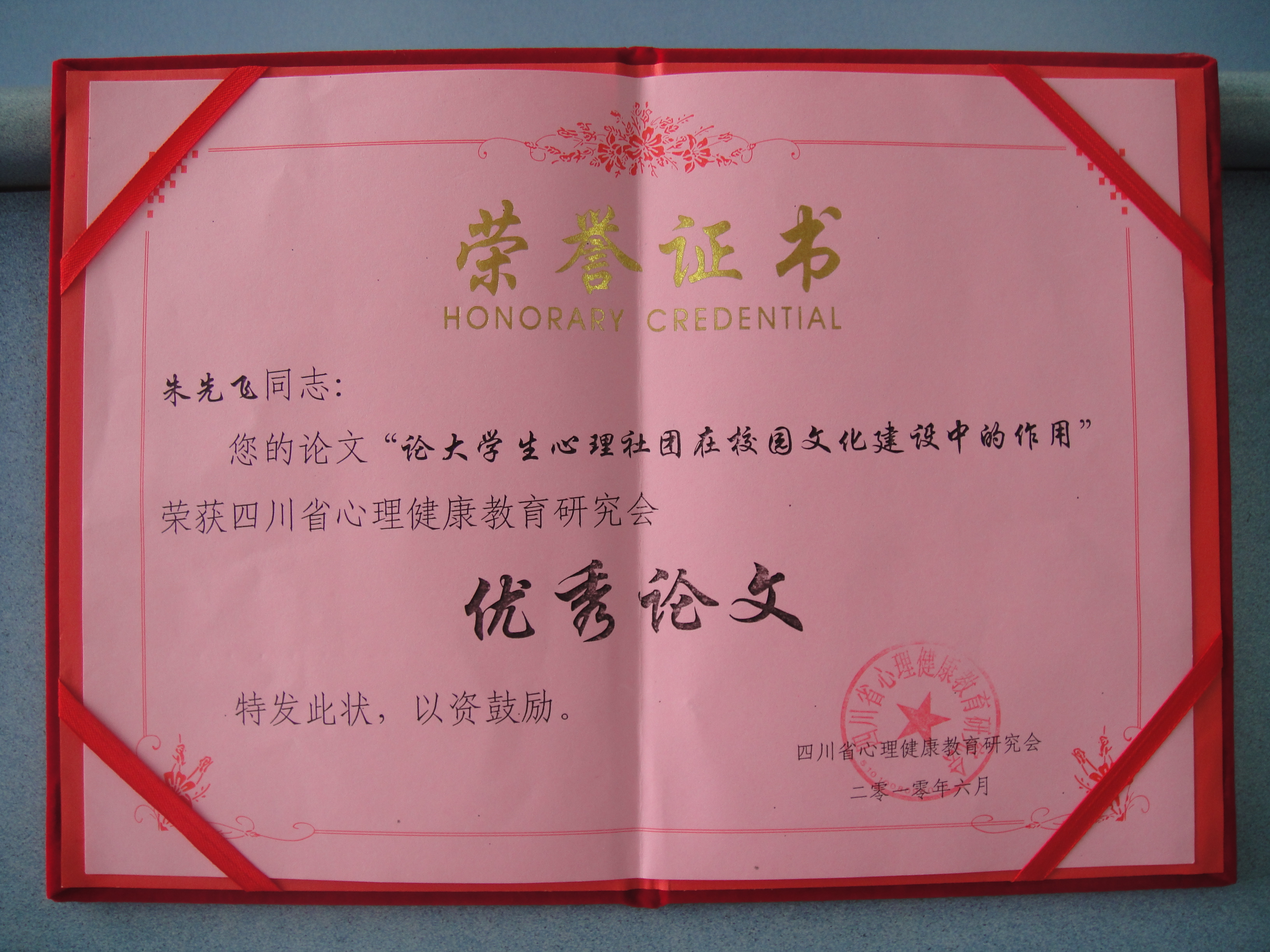经过大会专家组评审,该论文荣获了四川省心理健康教育研究会“优秀论文”的称号,研究会向朱先飞同学颁发了荣誉证书。