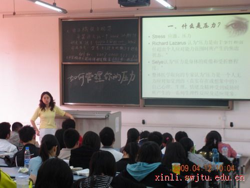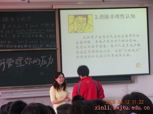 4月12日上午,我校心理咨询与研究中心田瑞琪教师在犀浦校区2213室作了“如何管理你的压力”的专题讲座。 本次讲座是心理咨询与研究中心举办的“心力论坛学生心理骨干培训”活动,旨在在学生中培养学生心理健康工作的骨干,更好地为全校学生服务,提高心理健康水平。 田老师从压力的定义、压力管理调节、识别压力预警信号、分析压力来源等方面对压力作了详细阐释。田老师说,当代大学生面临来自升学、就业及人际交往等方面的压力较大,而每个人面对压力的承受能力是不同的,这与自身的生活经历有关,所以每个人都应该寻找最适合自己缓解压力的方法。在面对压力的时候也应该采取正确态度,如做复杂事情时要减少紧张程度,做简单事情时要增强紧张程度;同时要通过增强自信、提高人际交往技能,争取社会支持等方法来提高自己的抗压能力。在讲座中,田老师还现场和同学们一起感受了肌肉放松减压法。 相信通过本次讲座同学们不仅对于压力有了新的认识,学会了简单易行的减压方法,更增加了应对生活压力的信心。