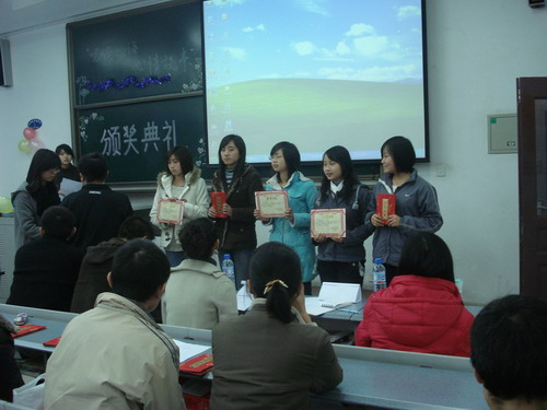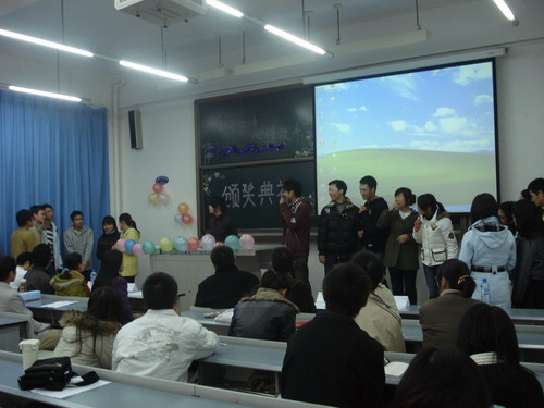 创造学会同学同样带来了精彩的节目,五位女生优美的歌声与搞笑的ppt图片让大家忍俊不禁,开怀大笑。接下来,主持人宣布了二等奖的获得者,由林剑栋为他们颁奖。