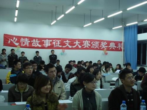 在大家的翘首期盼中,主持人公布了一等奖的获得者并请两位作者朗读自己的作品。段俊娥在其作品《我的阳关三叠》中描述了自己的心理历程:初见,成长,死亡,优美的语言恰如一首美丽动听的歌曲,向人们传达着她对生活及人生的理解与感悟。杨兴鹏老师为她颁奖并作出了点评,他从文中作者的心理历程出发,提出大学生应该认真打好基础,把握好自己的青春与机遇,度过充实而快乐的大学四年,待到回首看人生路时能够做到无怨无悔。另一位一等奖获得者 梁保国在《核桃树》一文中,用朴实无华的语言讲述了一个父亲对儿子最真挚,最热烈,最深沉却又无声的爱,淡淡的话语里包含了太多太多,引发了在座同学们的反思。徐建老师给予这篇作品很高的评价与赞赏,他认为这是从内心深处迸发出的对亲情的感动与抒发,朴素的语言却能绽放出最耀眼美丽的光华。