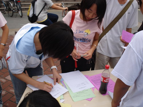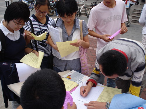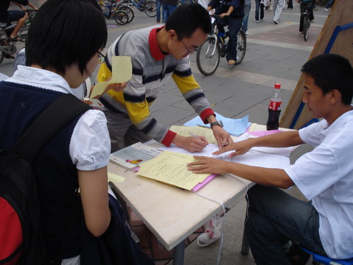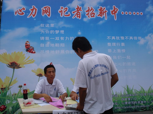 金秋迎来了新的学期,心力网也将迎来新的活力。9月17日,心力网记者团的记者们在孙勇团长的带领下,开始为心力网招聘新的记者。 记者团的成员们已在9月16日上午将招新用的展板摆在二食堂门口,17日中午正式开始招新。招新的地点设在二食堂和四食堂门口,他们将在那里进行为期三天的招新活动。 在招新的第一天,就有很多的08级新生填了报名表。孙团长表示,这样一来,不仅有更多的机会为心力网注入新鲆的“血液”,还将提高心力网在在校学生心目中的知名度。 据悉,记者团将在本周星期六(9月20号)下午2:00至6:00在X2341对所有来聘者进行面试,以公平公正的原则择优录取。