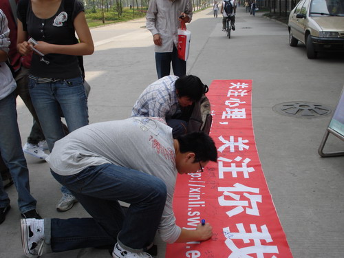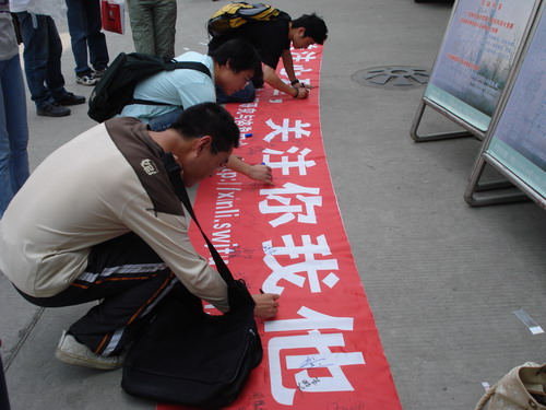 主办、心力网承办的大型横幅签名活动在二食堂门口正式举行。横幅标语 “关注心理,关注你我他”几个醒目的大字,提醒我们要时刻关注大学生心理健康问题。