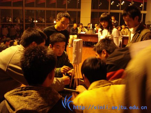 接下来是动手题——“搭砖头”。要求选手们在规定的时间内用筷子塔好架子然后架起仿真砖头大的纸砖头,比赛架起的“建筑物”的高度和坚固程度。 紧张的时刻到了,为了使“建筑物”尽量高又不至于在抽走部分筷子后“坍塌”,所有的队员们都绞尽脑汁用各种办法尝试着,他们已经忘了他们是舞台的中央。最先“完工”的是3130队,他们的作品接受检验——抽走4根筷子后依然屹立不倒。然而最成功的要数逆光队了,他们最后的作品高度超过38厘米并且在抽走6根筷子后仍是稳如泰山。这个赛题不仅考察选手的专业知识还涉及到他们的创意。正应了头脑奥林匹克的宗旨:只有创造,才有突破,才有提高,才有更大的成功。