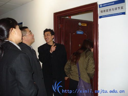 的历史以及成立后近两年的发展情况。 随后宁教授为他们详细介绍了心理测评与咨询实验室情况。最先向他们介绍的是中心最直观的门户网站——心力网。刘副局长等人在宁教授的引导下浏览了网站,并专门介绍了网站专业测评版块、教师信箱、心理咨询预约等内容,通过这样网站这个平台,可以帮助学生了解自己、认识自我,加强了师生联系,更好地为学生服务。在情绪宣泄与调节室,他们兴致勃勃地戴上拳击手套、拿起发泄棒、宣泄小动物各自发泄一番。在生物反馈团体心理训练实验室,为他们进行了短暂的心理放松训练,亲身感受到先进技术带来的良好效果。在虚拟现实心理治疗实验室与音乐心理调适实验室,观看了由中心教师指导、学生制作的心灵感悟片,对中心做出的一系列工作表示肯定和称赞。