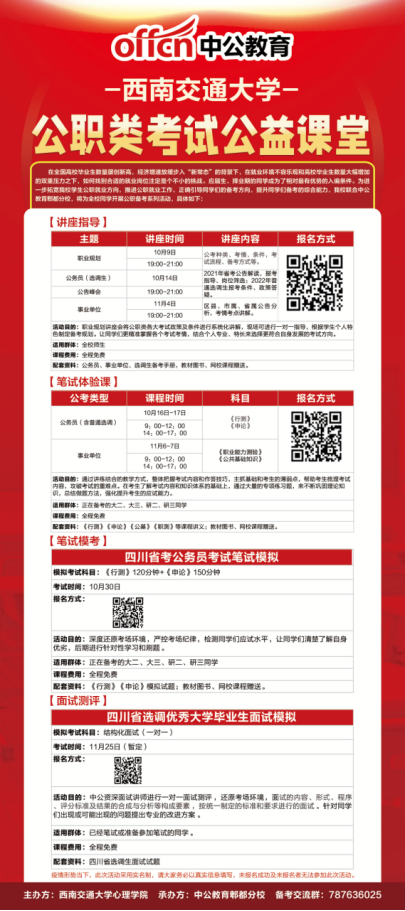 针对2021下半年公务员考试(省考、国考),为同学们讲解考试条件、考试内容、报考流程以及如何优质选岗;提供近两年各地录取参考分数线,让同学们更清楚、直观了解公考形式,针对性的备考。