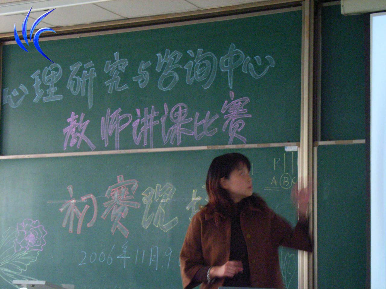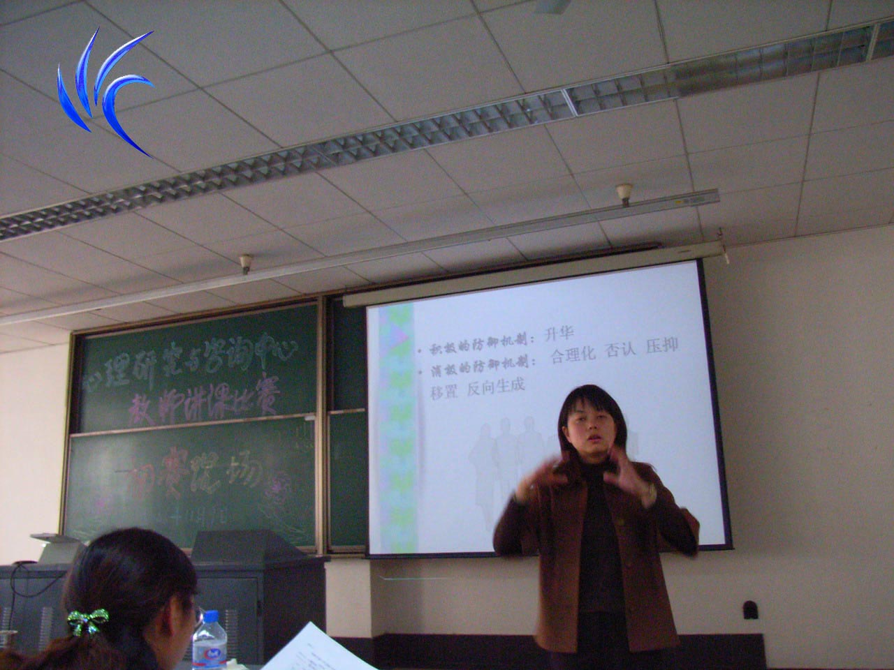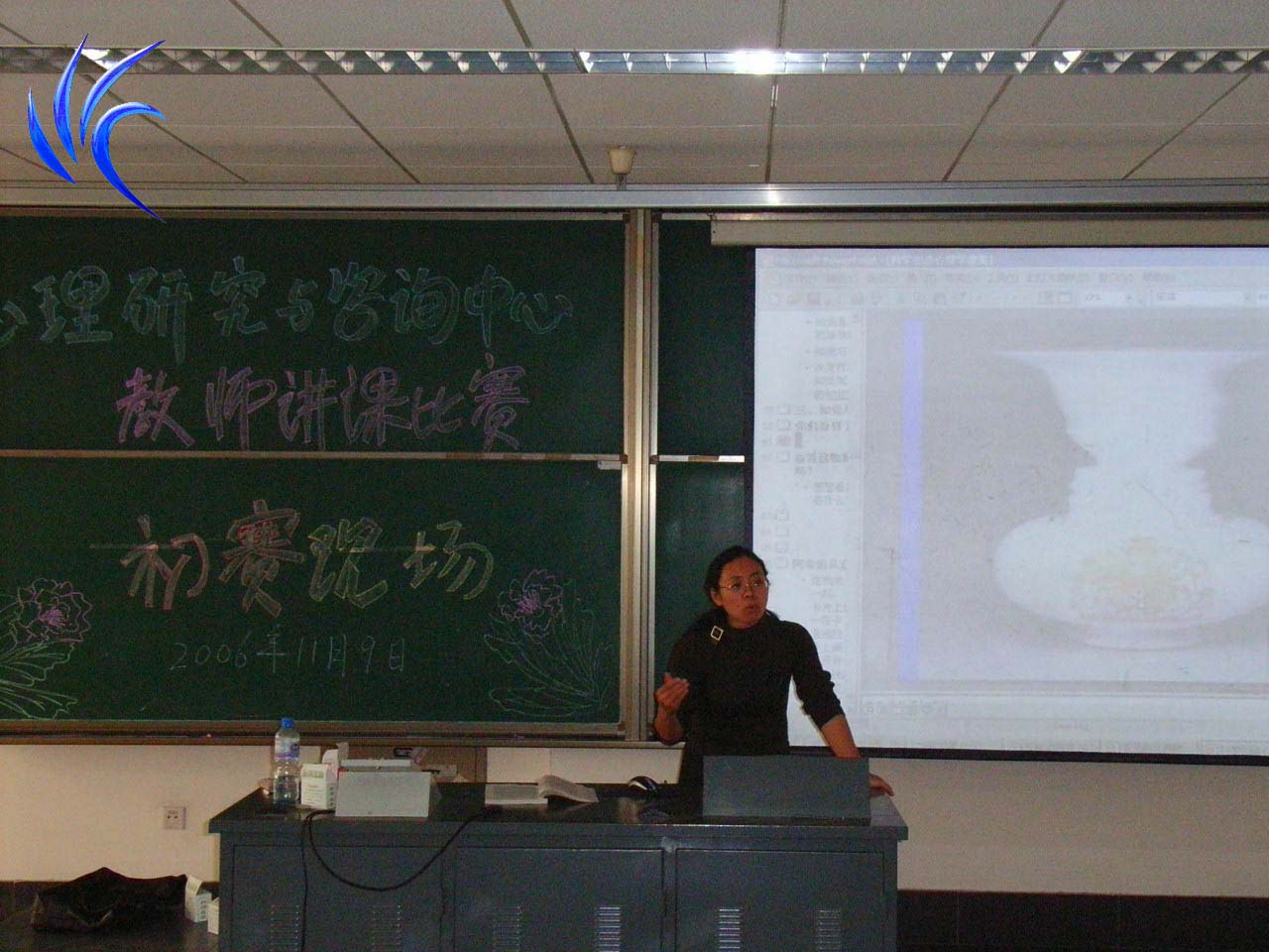 本次比赛中,初赛名单中共有七位中青年教师。首先上台的是何立群老师,她的精彩讲授很快吸引了大家的注意力,再看她端庄的仪表、从容的表情、自信的神态、严谨的内容、丰富的资料......,所有这些足可以看出她的理论造诣颇深,教学实践丰富.然后,高老师清脆洪亮的声音在整个教室回荡,她那含蓄的微笑,适中的语速,风趣的语言以及”李伯清”式的演讲调动了在场所有听众的积极性,由此,可以推测高老师积极乐观的生活态度. 之后,田老师、马老师等几位老师分别针对不同主题,给大家上了一堂别开生面的心理课。