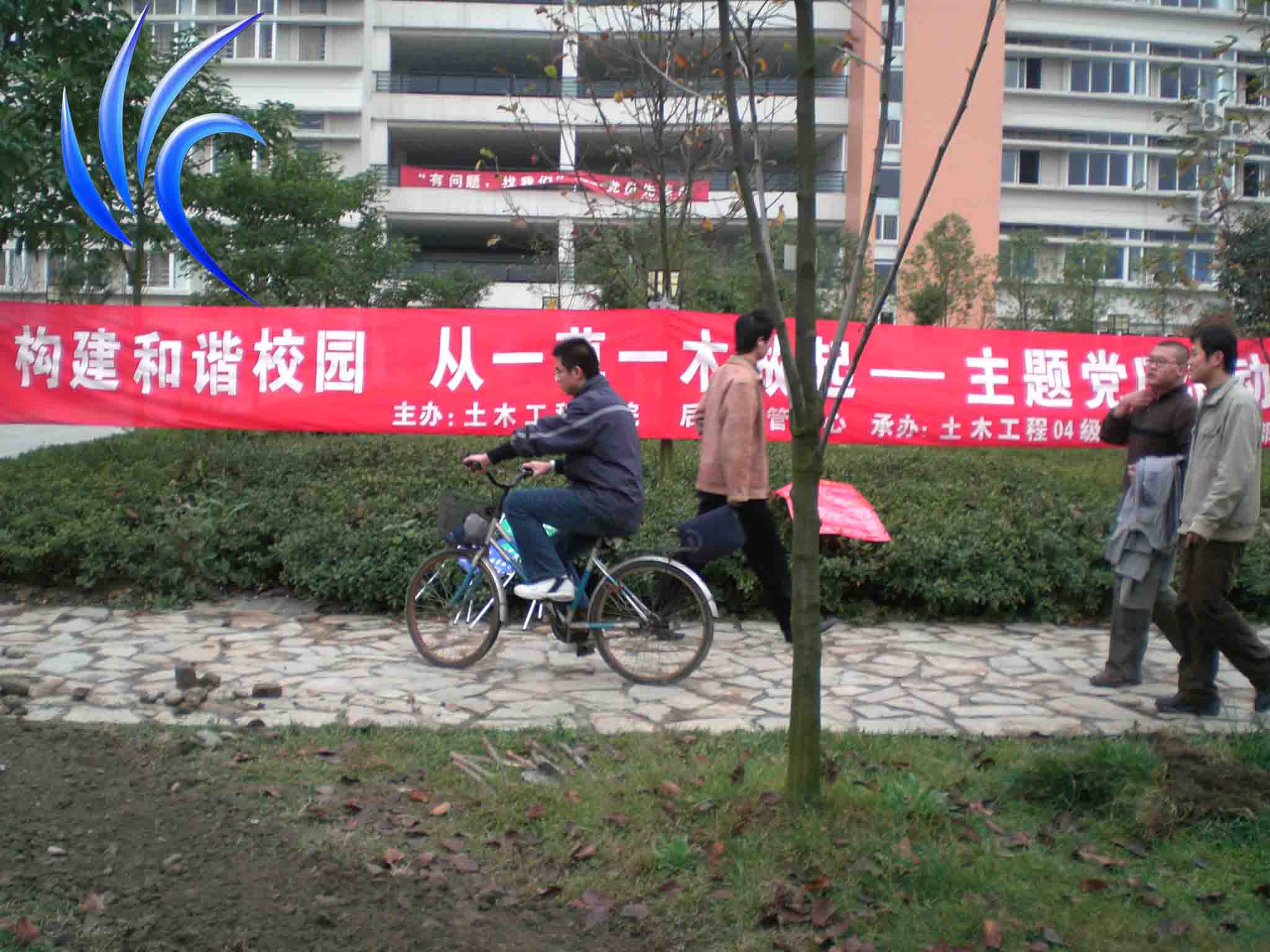 (心力网 11月26日)今天上午9点左右,本站记者在校车站附近的草地上被两幅鲜亮的横幅吸引,横幅的内容是“构建和谐校园,从一草一木做起”“万物用美丽美化世界,我们用行动美化校园”,走近一问才了解到这是我校土木工程学院04级茅以升班党支部联合物管中心展开的党日活动,目的在于美化我们的校园。在现场我们见到了约二十名同学在辛勤地劳动,汗水流淌过他们的脸颊,泥土弄脏了他们的双手,可是他们仍然毫无怨言地工作。我们还见到了土木工程学院的党委江富长副书记,物管中心工程部部长刘国圣先生以及同学们的辅导员姬晓旭老师。记者对江书记进行了采访,江书记表示,希望同学们能够在美化校园的同时增强社会责任心。