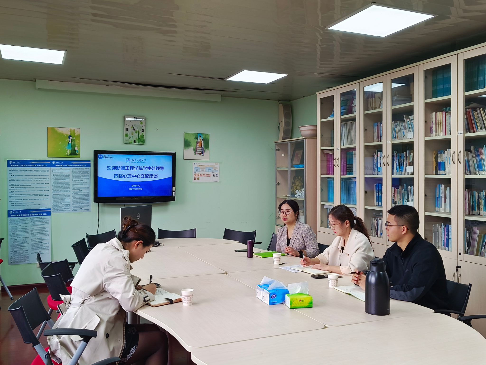 2024年10月25日上午,新疆工程学院学生处教师王振文到心理咨询与研究中心就心理教育建设及学生工作进行座谈交流。心理健康教育教研室李玉梅老师,学工组副组长樊菊,辅导员邹涛波出席座谈会。