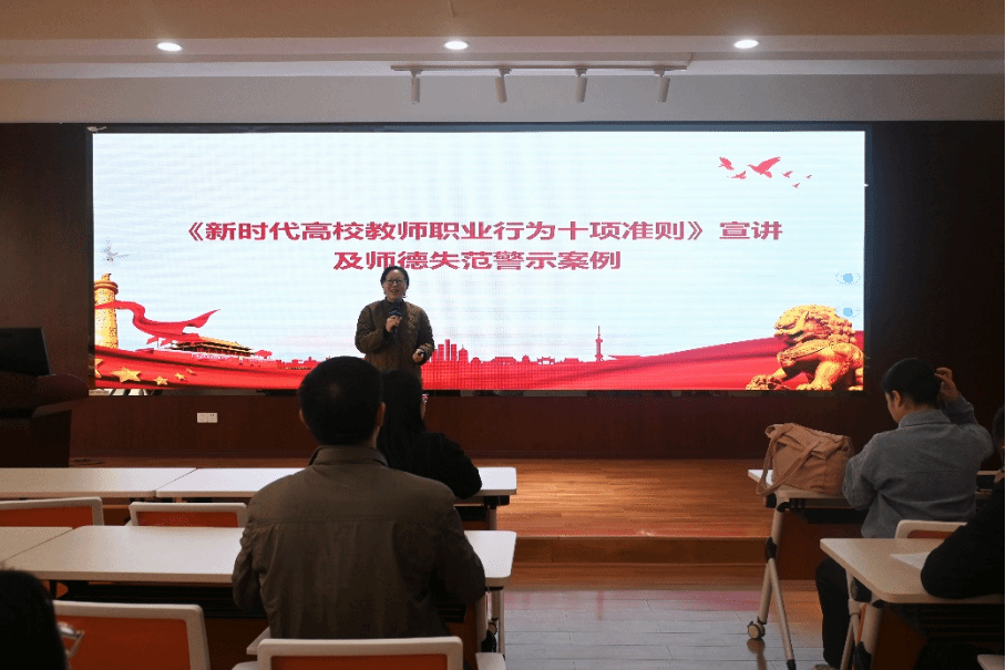11月7日,中心主任高雪梅为中心全体教职工进行了《新时代高校教师职业行为十项准则》宣讲及师德失范警示案例分析。高雪梅首先对《新时代高校教师职业行为十项准则》进行了全面而深入的解读,明确了新时代背景下高校教师应遵循的职业行为规范。随后,她通过几起高校教职工失德失范的具体案例,进行了深刻的警示教育,提醒每一位教职工要时刻铭记教师职责,以身作则,树立良好的师德师风形象。