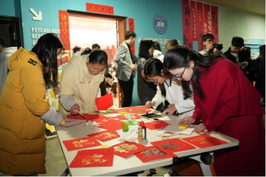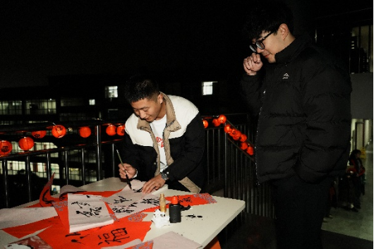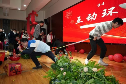 晚会中穿插了“运动达人”、“音乐发烧友”、“奥斯卡小金人”等有趣的互动环节,师生们上台游戏,趣味横生;会场还布置了书法、拓印、饺子集市,师生们写春联、印福字、煮饺子,参与感满满。