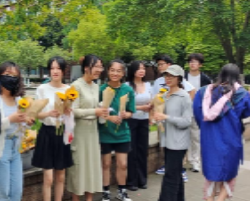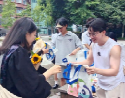 在毕业的钟声即将敲响之际,母校和中心为大家准备了一份满载祝福的毕业礼物:象征智慧与勇气的毕业学士熊;富有创意的中心文创品;寓意着向阳而生、逐梦前行的逐梦向阳花;寓意着新旅程开始的启航登机牌;以及记录着青春足迹的青春纪念册。刘咏梅书记亲手将这些满载深情的礼物赠予毕业生代表,并送上了饱含深意的祝福与寄语:"百舸争流千帆竞,波涛在后岸在前。风好正是扬帆时,奋楫逐浪天地宽。初心如磐践使命,不负韶华谱新篇。"