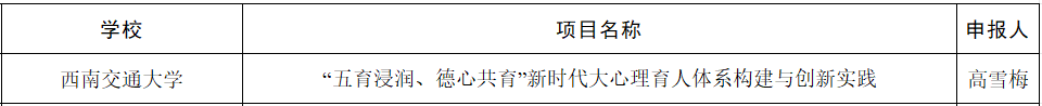 近日,四川省教育厅发布《四川省教育厅办公室关于公布2025年度全省高校思想政治工作质量提升综合改革与精品建设项目遴选结果的通知》(川教厅函〔2024〕39号),公布了2025年度四川省高校思想政治工作质量提升综合改革与精品建设项目名单,中心主任高雪梅教授牵头的《“五育浸润、德心共育”新时代大心理育人体系构建与创新实践》成功入选高校学生心理健康教育指导典型案例。