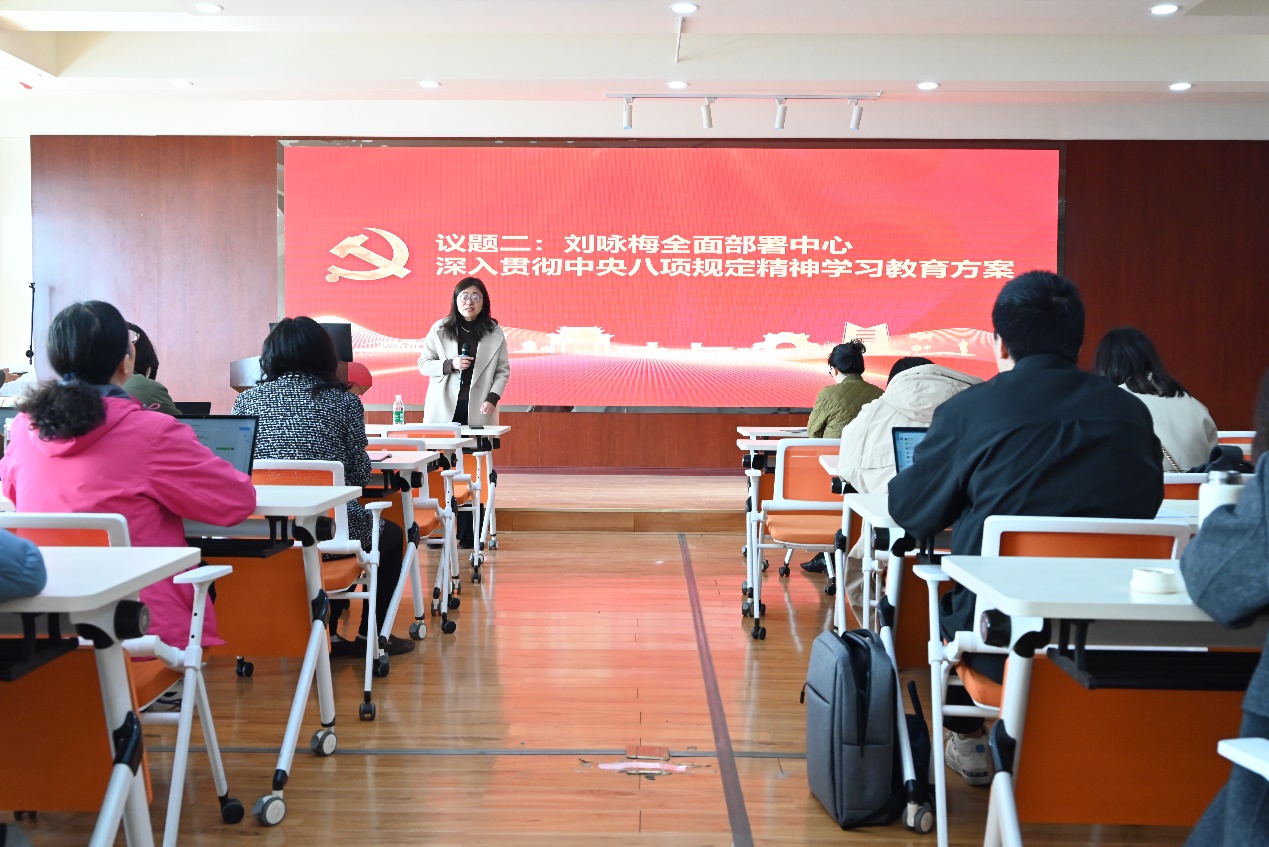 会议第二项在党员干部、教职工层面,同步启动“深入贯彻中央八项规定精神学习教育”动员部署工作。刘咏梅对学习教育提出具体要求:一是原原本本学习习近平总书记关于加强党的作风建设的重要论述和中央八项规定及其实施细则精神;二是师生党支部要有针对性地开展“党风政风、师德师风、校风学风”主题党日,通过“三会一课”、支部书记讲专题党课等,组织师生党员、干部学习;三是全面从严深入查摆问题,紧盯科研经费、师德师风、招标采购、招聘进人等重点领域环节,坚持有什么问题就解决什么问题,什么问题突出就重点整治什么问题,立查立改、即知即改;四是开门教育,中心党员、干部要立足岗位,在助力学校高质量发展、推动中心改革发展中担当作为、服务师生,逐步完善健全作风建设常态化长效化制度机制。