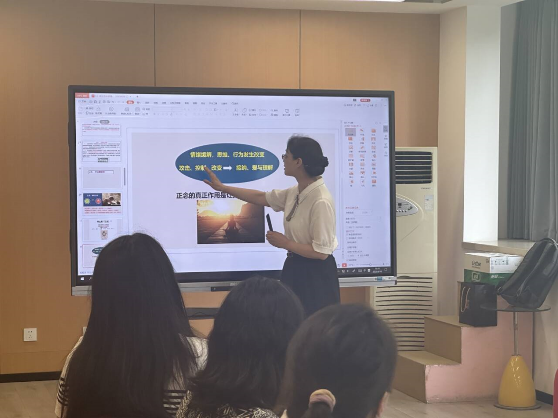 为帮助教师深入理解 “正念” 内涵,唐静老师从科学原理和感性体验两方面阐释正念的作用,既讲解了正念的心理学机制,又让教师真切感受正念过程中的身心状态,有效缓解了教师日常工作中的压力。