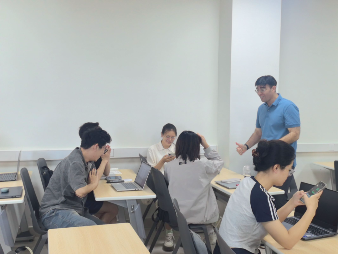 7 月 10 日下午最后一场的"Publishing in Top-Tier Journals (PNAS)"课程堪称"压轴大戏"。Dr. English系统讲解了manuscript提交的完整流程,包括选刊策略、同行评议应对技巧、以及如何处理拒稿和修改意见。他还分享了自己在PNAS发表论文的宝贵经验,为学员们揭示了顶级期刊发表的"内在逻辑"和成功秘诀。同时,结课小组汇报在 X30555 教室紧张欢快的节奏中完成。各小组围绕跨文化心理学相关主题,结合课程所学的研究设计、数据分析及写作思路,系统呈现了各组研究计划的选题背景、研究框架、方法设计、时间规划、目标期刊等内容。Dr. English与中方教师对每组汇报逐一进行点评与指导,现场互动频繁,学术氛围浓厚。学生们表示,通过汇报实践,不仅深化了对课程内容的理解,更提升了团队协作与学术表达能力。