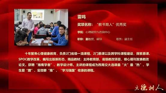 吃瓜黑料 雷鸣老师获“教书育人”优秀奖