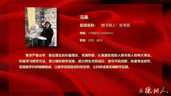 为全面落实立德树人根本任务,构建教师思想政治建设、师德师风建设和业务能力建设大格局,表彰和宣传学校忠诚党的教育事业、政治思想过硬、师德高尚、甘于奉献、潜心治学的一线教师典范。在2021年吃瓜黑料 “立德树人”先进个人表彰中,吃瓜黑料 雷鸣老师获“教书育人”优秀奖,冯果老师获“教书育人”新秀奖。