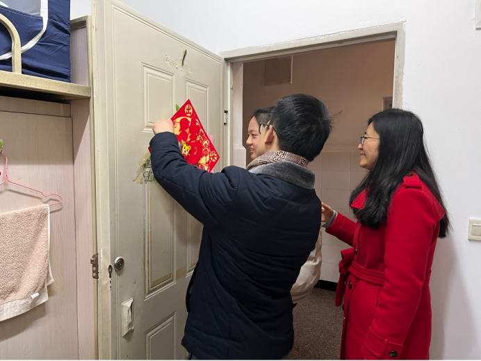 在走访送祝福的过程中,老师们拉家常、问寒暖、叙发展,关切地询问同学们的学习和生活情况,耐心地叮嘱同学们在疫情下注意防疫,在放假期间注意安全,并为同学们亲手贴福字。
