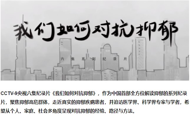 为了促进抑郁症防治,倡导大众关爱精神健康,中央电视台CCTV-9纪录频道于2021年10月14日开始,连续播放了中国首部大体量、全方位抑郁解读纪录片《我们如何对抗抑郁》。