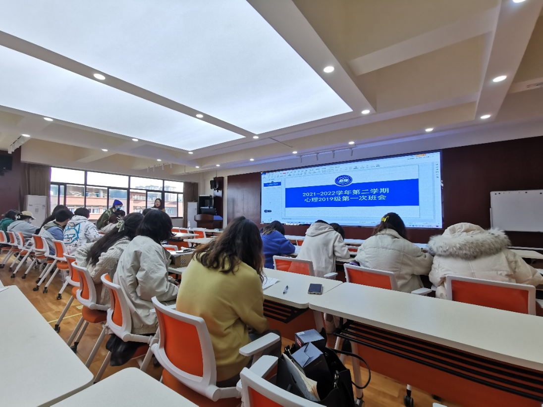 2022年3月4日15:50在X5501召开2019级本科生2021-2022第二学期第一次主题班会。本次班会由辅导员靳涵主持,2019级全体同学参加。