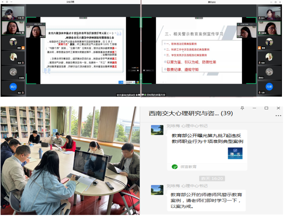 中心党委依托中心工作群及时推送警示教育案例,持续加强全体教职工作风常态化教育提醒;依托职工大会和理论学习中心组扩大学习组织开展中层干部和年轻干部的培训教育,强化干部理想信念坚决反对特权思想。在4月7日线上召开的教职工全体大会和4月8日的中心组扩大学习中,中心党委书记刘咏梅同志通报了学校纪委关于用好身边案例加强警示教育的通知,与会人员集中学习了学校整理的4个方面共10个典型警示案例。中心党委要求以此次学习为契机全面做好中心全体师生员工的警示教育。中心组学习中强调各党委委员和干部要严格要求自己,遵守纪律,带好头,各项工作开展和经费使用要严格执行报告制度,按照规章制度流程审批办理,守好廉洁底线。