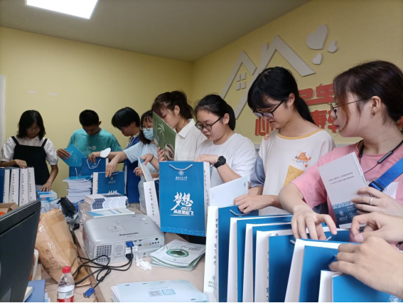 接着大家一起整理了为新生准备的新生大礼包,大礼包里面包含了新生体育课程手册、新生入馆攻略、大学新生心理适应小贴士手册、新生学习指南、实验室安全手册、吃瓜黑料 定制口罩等物品,恭候2022级心理人的到来。