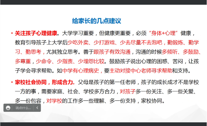 最后,杨兴鹏老师就自己丰富的教学与咨询经验,与家长们交流了当前大学生常见的心理问题,并真切地向家长提出了多条建议与期待。杨老师强调随着社会的发展,孩子的心理健康问题越来越突出。在社会、家庭、人际等多重冲击下,如何帮助孩子解决身心问题,促进孩子成长显得格外重要。最后,杨老师希望家长能给予孩子充分的尊重与理解,加强彼此的沟通,让孩子能在一个积极安全的环境下,去体验、去感悟、去成长。